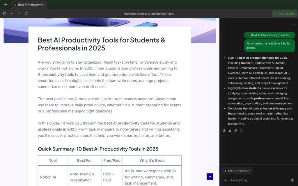 One of the most useful features of Atlas is the Ask ChatGPT sidebar.